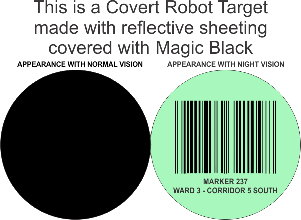 Infrared Coatings Magic Black Screen Printing Ink Formulations are used by Anytime Sign http://www.anytimesign.com to make Covert Robot Targets. |